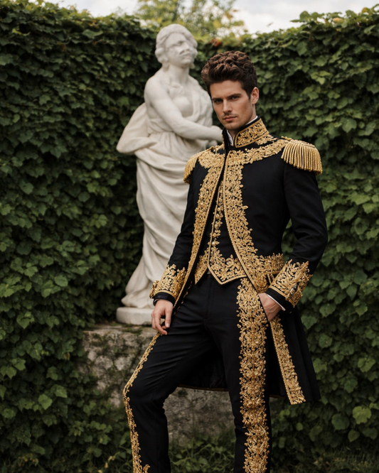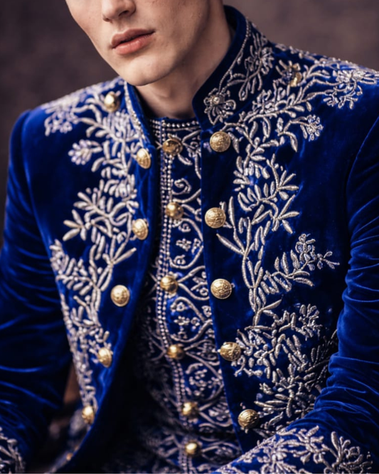 We use only the finest globally sourced fabrics—Italian silks, Indian velvets, English wools—brought to life with embroidery crafted by skilled artisans. No mass production, just timeless detail and uncompromising quality.
